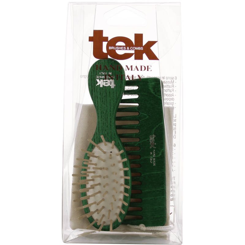 Our kit, including a brush and comb in green 100% FSC®-certified ash wood in a natural cotton pouch, is ideal for travelling or slipping into your purse. They are finished, sanded by hand and treated with vegetable oils and waxes. The kit is perfect for all hair types: the brush detangles and the wooden pins avoid the static hair effect. The comb, essential for detangling knots, is ideal for applying masks and conditioners. It is suitable for all hair types to care for your look wherever you go.